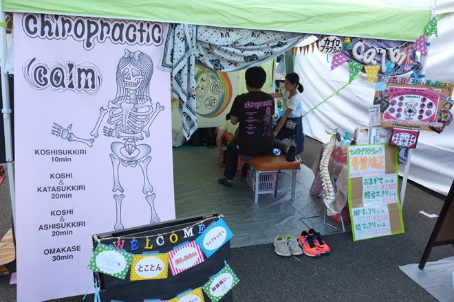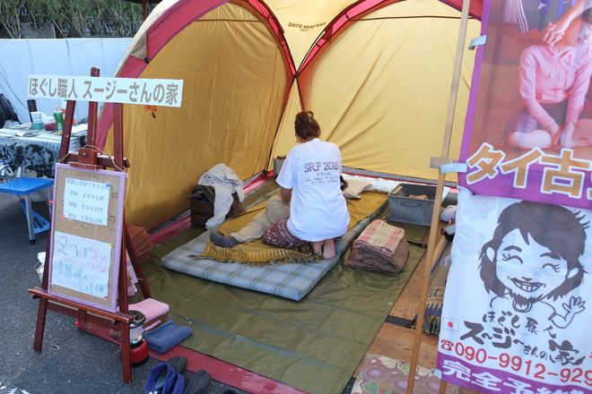 サンブラスやTシャツなど夏フェス必須アイテムも多いけれど、なかには、タイ古式マッサージやカイロプラティックのサービスなども出店されていて、それはそれはフリーダム。その自由さと開放感は、<全日本フォークジャンボリー>から脈々と続く中津川という土地が育んだものなのかもしれない。