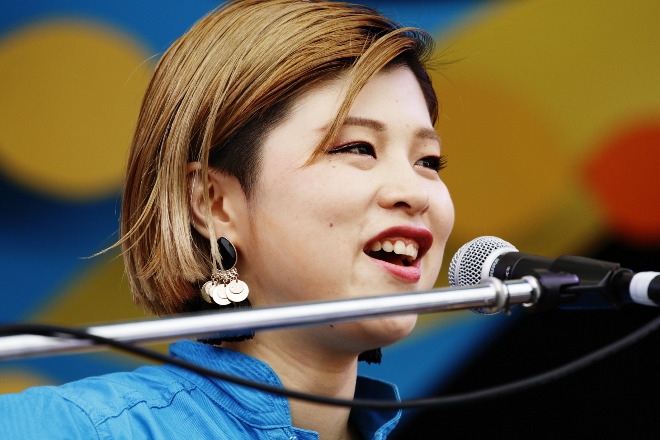 今年に入り二代目社長としてiCasが就任(初代のうつみようこは名誉会長へ勇退)。フレッシュな布陣で新曲をがんがん作っている彼らがまず披露したのは「ギリギリ政府」だ。途中、佐藤タイジが哀愁のメロディを、iCasがバッキングを奏でる中、高野哲が拡声機を手に叫び出す。「インディーズ電力は毎年必ず出演していますが、毎年規模がでかくなってますね。入場者数も増えておりまして、去年が最高だったんですけど、私が聞いた情報によりますとすでに5,000人くらい上回っているそうです。3万人近く集まっていると。専務取締役佐藤タイジが発案&実行委員。みなさん、ソーラーマン佐藤タイジに大きな歓声を!」という粋な計らいを、タイジは照れながらも笑って受け止めた。