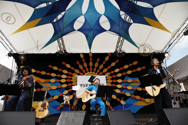 ここでセットリストを急遽変更。昨日キッズエリアにてiCasと高野哲の特別編成で演奏したという替え歌、「グリーングリーン~中津川」が届けられる。ビートルズの「Get Back」風サウンドに、“あの日タイジとiCasと語り合ったさ/この世に生きる喜び/そして太陽のことを/グリーングリーン中津川/ことりがうたい/グリーングリーン中津川/緑がゆれる”の歌が乗る。まさにみんなで歌えて楽しめる本フェスのテーマソングだ。ラストはやっぱり「レッツゴー電力」。最後のフレーズをタイジがミスったのもあってか(笑)、満面の笑顔による締めくくりとなった。その場にいた、あるいはこれを読んでいる社員(ファン)のみなさま、本日の業務もお疲れ様でございました。