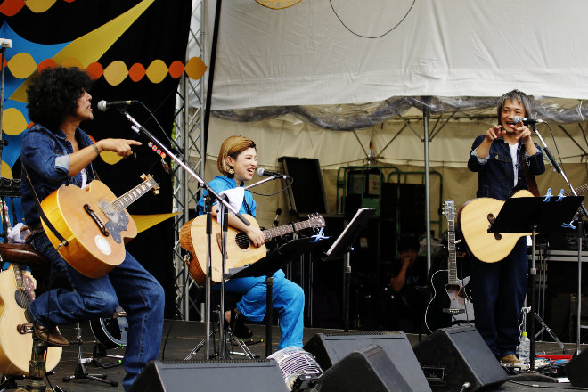 続いて「マネー」はミュートを効かせたジャングルビートと、2番でメロディを紡ぎつつファンキー成分がしとどに溢れる独特のリズムも刻むタイジのギターが冴えていた。ギターボーカル3人という編成を生かした輪唱もすごい楽しい。「響いてほしい」ではタイジがボイスパーカッションに挑戦。そのビートをルーパーで終始保ちながら、切ないムードの前半を経てサビで花開く壮大な歌謡性とあたたかな願い。とってもいい曲だ。