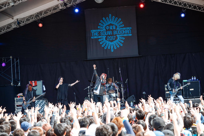 それに応え、観客も大暴れ。「いま、一番大事にしている曲」とNOBUYAが言った「「70cm四方の窓辺」」、シャッフルとも音頭っぽいとも言える跳ねるリズムに合わせ、観客が飛び跳ね、「響け! 中津川!」「SOLAR BUDOKAN!」というコール&レスポンスでさらに盛り上げた「響く都」、ザクザクザクと唸るメタリックな演奏がウォール・オブ・デスを誘った「銀色スターリー」と重ね、さんざん盛り上げたところでダメ押しするようにお見舞いしたのが彼らの代名詞とも言える「金色グラフティー」。