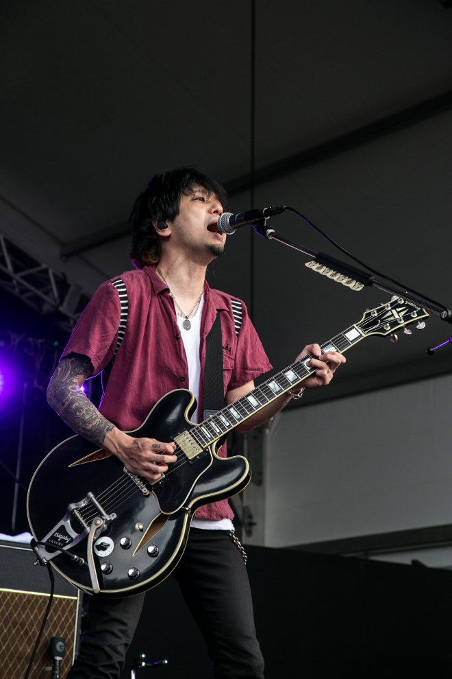 大喜多崇規(Dr)のドラムカウントをきっかけに、ギブソン製シグネチャーギターを持つ生形真一(G)のリフ一閃。「Spirit Inspiration」によるオープニングだ。大地をぶった斬るような迫力が押し寄せ、その波をさらに押し広げるように村松 拓(Vo, G)と日向秀和(B)が前方へ飛び出しオーディエンスを煽っていく。特に、俺こそ最強付いてこい!といった振る舞いで、フロントマンとしての類稀なる資質をフルに放出している最近の拓は、もう歌う前からその場の全員を惹きつけているようだ。