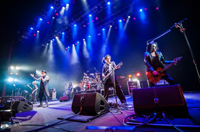 幕が開き、紫のライトが呼吸するように明滅する中、SE「Kilmister=Old NO.7」に乗せてD’ERLANGERが登場。4人が向き合うと、瞬時にして殺気に満ちた風が巻き起こり、打ち鳴らされる迫真のアンサンブル。音の塊がステージの奥からこちらへとグイグイと迫ってくる猛烈な勢いを体感する。「NOIR‐D’amour」のkyoのシャウトは冴えわたり、CIPHERのギターソロからは危険な香りが立ち上る。「Harlem Queen Complex」「Harlem Queen Romance」と初日同様の流れながら、太く重いグルーヴは一層艶を増して感じられた。「昨日に引き続いて、禁断の扉、2枚目が開きました。昨日にも増して、濃いね!」とkyo。「昨日の逹瑯といい今日の葉月といい、ネタにされてますぜ? “お嬢ちゃ〜ん”」と笑わせると、「今日は野郎も多いからね。殿方とは俺は言わないよ? “お兄ちゃ~ん”」と葉月のMCに返答。