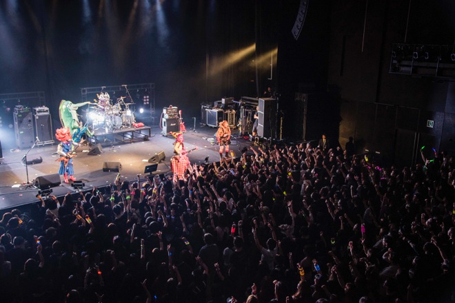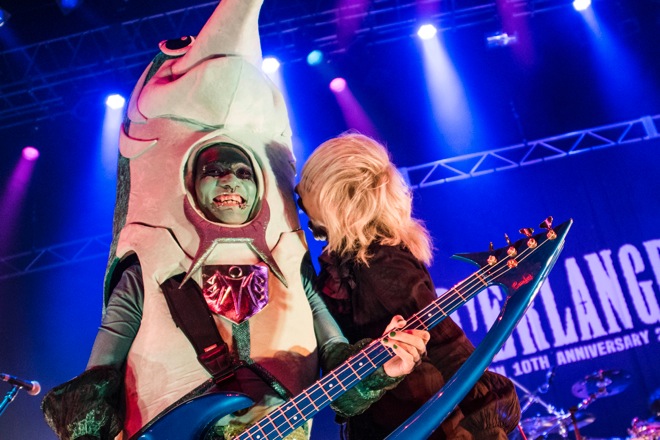 2番目に登場したのはPsycho le Cému。幕が開くと色とりどりの被りモノ衣装に身を包んだメンバーが姿を現し、「BLADE DANCE」に乗せコミカルに歌い踊る。シュールな光景に度肝を抜かれていると、ようやく楽器を構えてメタルにハードロック、J-POPなど雑多な要素を飲み込んだ楽曲群を、たしかなテクニックに裏付けされた歌と演奏でエンターテインメント色豊かにライヴを展開していく。「最高の夜に、この曲を贈りたいと思います!」(DAISHI/Vo)との言葉からスタートしたのは、メロディアスなポップナンバー「愛の唄」。ハリのある凛とした歌声と陽のオーラに気圧される。「ノスフェラトゥ」「oneday」とアッパーな楽曲群を連打し会場を温めると、「まさか僕たちが招待されるとは……皆も、僕もびっくり(笑)」と異色の佇まいであることに自ら触れながら、「こう見えて高校3年間、D’ERLANGERのコピーバンドやってました。どこで道を間違えたのか……(笑)。高校生の自分に教えてあげたいですね」と熱いMCをしたDAISHIに大きな拍手が起きた。トリビュートアルバムに参加したことを「思わぬところから夢が叶った」と感慨深そうだ。