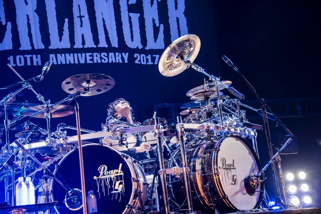 オーラスは豪華セッション。kyoがTetsuと晁直(Dr/lynch.)を呼び込み、「D’ERLANGER with 晁直で、お嬢ちゃん、激しいの行こうか?」と「dummy blue」をコラボレーション。サビはまず晁直に任せ、2番のサビも立ち上がってエアでスティックを動かし、晁直を引き立てるTetsu。メロディーはドリーミーで美しいが、この顔合わせで聴くサウンドは、曲が宿す直情的な男っぽさが引き出されているように思えた。2人は、3人が見守るなかドラムバトルを繰り広げ、間も含めて互いのプレイを読み合って延々とプレイ。照明も連動し、熱の昂りを後押しする。最後は2人で音を重ね、爽快な幕切れとなった。