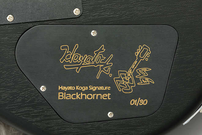 この意見を元に開発された「BLACKHORNET/PRO」は、極めて貴重な木材のホンジュラスマホガニーで製作。耐久性の高いUSA製の最高級パーツを随所に用い、一切の妥協を排除して完成した究極のプロモデルとなっている。音響特性に優れたこのホンジュラスマホガニーは中音域がふくよかで、倍音成分も豊富なのが特徴。塗装は非常に被膜の薄いオープンポア仕上げにしたことで、ボディ鳴りの良いギターに仕上がった。数量は限定30本。シリアル入りバックプレート付き。