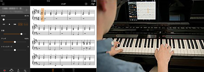 注目は、オーディオ音源からその曲のコード進行を読み取って、ピアノ用の譜面(伴奏譜)を自動作成する世界初の機能「オーディオ トゥー スコア機能」。ヤマハが独自に開発した専用アプリ「スマートピアノスト」をダウンロードしたスマホやタブレットと、ピアノ本体を連携させることで、スマホ/タブレット内に保存したどんな楽曲でも、即座に40種類のピアノ譜を自動的に作成。その中から好みの譜面を選んでスマホ/タブレット上に表示させ、ピアノ本体のスピーカーで曲を再生しながら弾くことで、その曲の演奏に参加しているような気分が楽しめる。