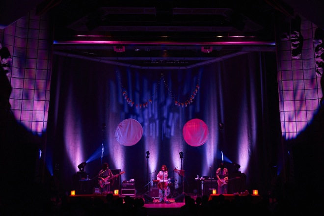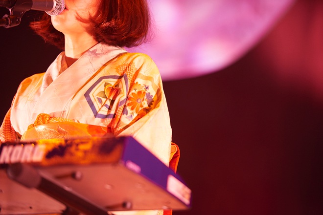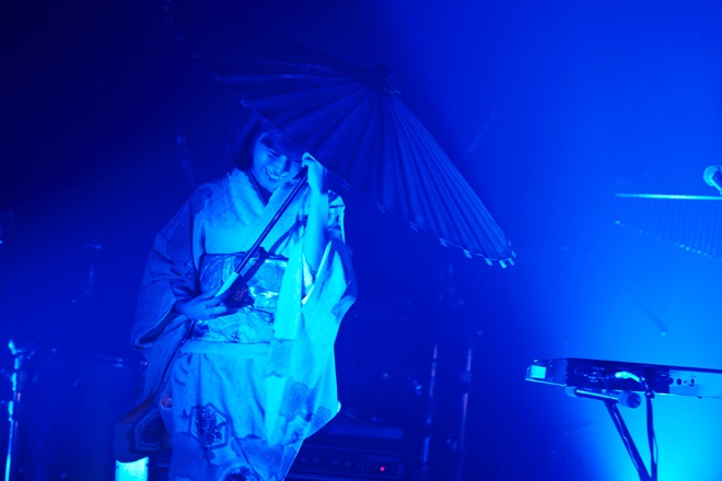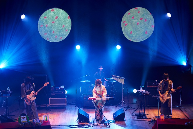 開演時間、ステージに現れた石井がギターをかき鳴らし、続いて安西、高城、内田の順番でステージへ。ライブは2ndアルバム『ごめんね』収録曲「街はいつも雨のよう」で幕を開けた。続く2曲目も初期の楽曲「トゥーファー」で、序盤から会場の雰囲気をふくろうずの世界へ一気に導いていく。また、この夜のステージは、最新アルバム表題曲「びゅーてぃふる」のミュージックビデオ同様、内田が着物、サポートの高城を含む男性メンバーも和装で、ステージ上には紙ふうせんが置かれているなど、“和”のムードが漂うものだった。