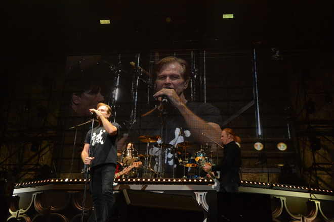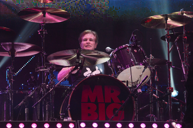 その歌声もルックスもまるで時間に置き忘れられたような若さを保ち続けるエリック・マーティンに導かれ、「アメリカン・ビューティ」で観衆はMR.BIGワールドへと引っ張り込まれていく。パット・トーピーの代役マット・スターもタイトなドラミングで楽曲を盛り上げるが、「アンダートウ」が終わったところでエリックは「ちょっと待った。何かが足りないよな?」と問いかける。その答えはもちろん“パット・トーピー”だ。大歓声の中、そのパット自身がステージに登場。スクリーンには彼の笑顔が映し出された。