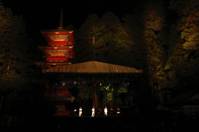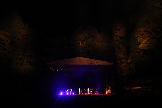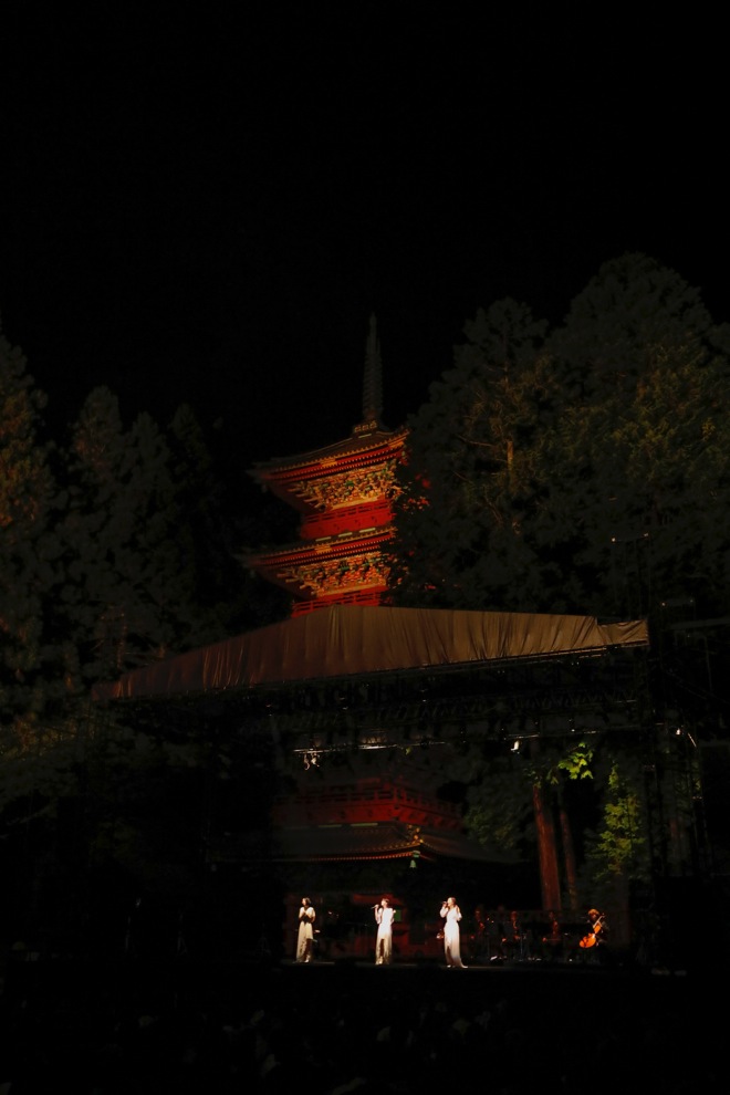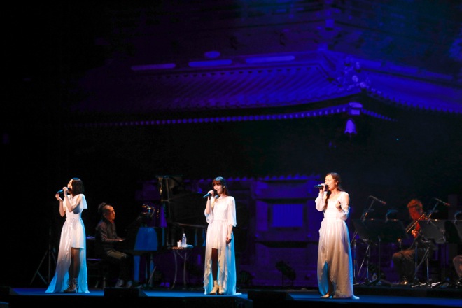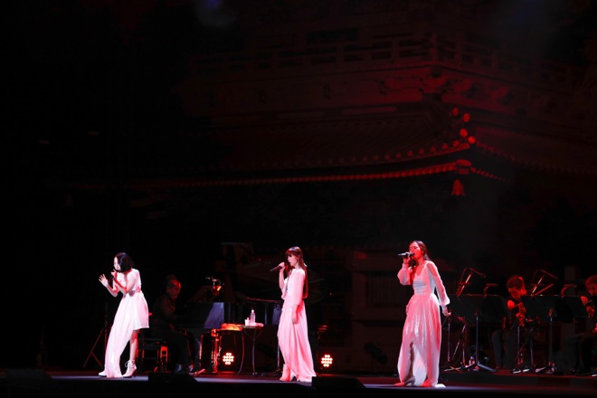 19時、星空が輝き、風ひとつない日光東照宮の五重塔前の特設ステージで、弦とピアノのみで構成された“Kalafina with Strings”の演奏によるライブがスタート。神殿に相応しい真っ白なドレスを思わせる衣装でKalafinaの3人が登場すると、駆け付けた1500人のファンから大歓声と拍手が沸き起こった。一曲目は歴史的舞台に相応しくNHK“歴史秘話ヒストリア”の主題歌でお馴染みの「storia」だ。