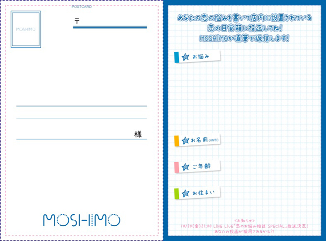 なお同企画は、MOSHIMOが定期的に配信を行っているLINE LIVEに毎回200件を超える恋のお悩み相談のメールが送られることを受けて考案されたようだ。恋の目安箱は10月3日(火)から10月9日(月)まで設置される。