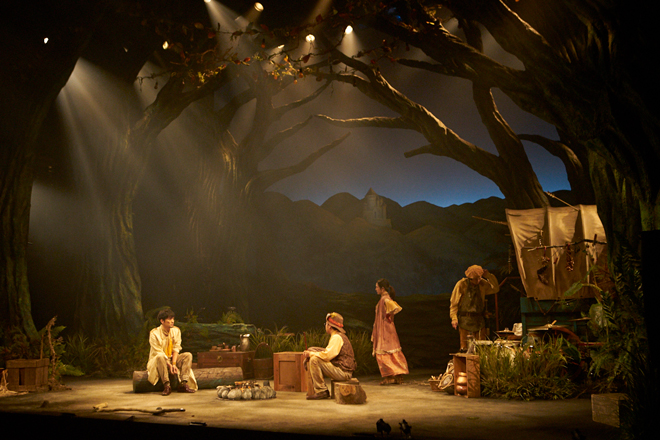 開演時間になると御徒町が客席に姿を見せ、小さな鐘を鳴らしながら「始まりますよ」と舞台の幕が開くことを告げる。森の中を模したステージに最初に登場したのは、森山。「こんばんは、ナオタリオ(森山の役名)です」と挨拶し、歌手・森山直太朗の原点とも言える「レスター」を弾き語りで披露。観客を<あの城>の世界に引き込んでいく。