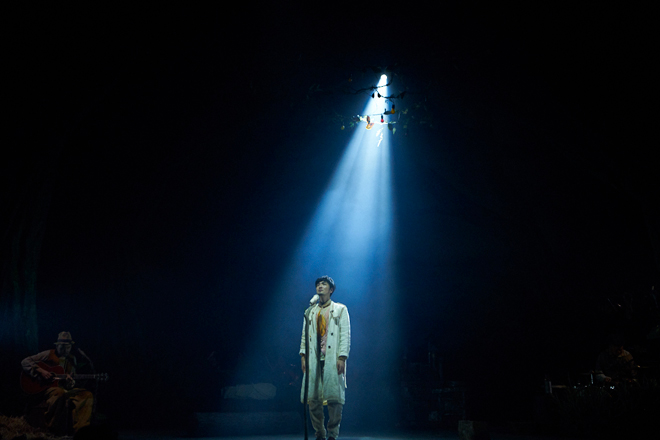 御徒町が紡ぎ出すストーリーに深みと彩りを与えるのはもちろん、森山の歌。セリフに込められた“幸せとは何か?” “自分とは何か?”という根源的なテーマと「Que sera sera」「雨だけど雨だから」「生きる(って言い切る)」などの楽曲が重なり合い、物語と音楽が有機的につながっていたのだ。「糧」「自分が自分でないみたい」など、この公演のために制作された新曲も披露。また、マイクを通さない生声での歌唱、客席から舞台に向かって歌うシーンが用意されるなど、通常のホールコンサートとは違う劇場公演ならではの演出も。“歌手・森山直太朗”の生々しい歌声を体感できたことも、この公演の大きな魅力だった。