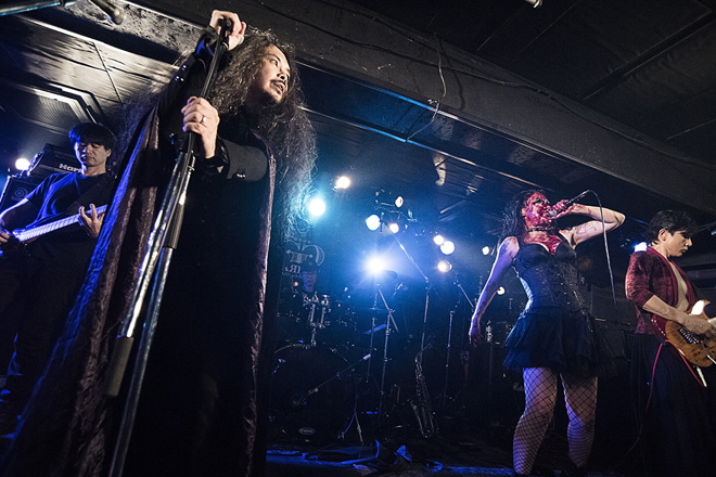 不動のバンド・リーダーでボーカルとフルートを担当する川嶋未来は、初日と変わらぬ黒装束とダークで怪しいステージ・プレゼンスをかもし出していたが、ボーカル/サックスのDr. Mikannibalは同じ黒いコスチュームながら、より表情豊かでアッパーなムーブメントで強烈な存在感を放つ。初日のヴェノムに代わってカバー曲コーナーではデスの「イーヴル・デッド」をプレイ。初期SIGHからライブでプレイされてきたこの曲だが、Dr. Mikannibalをセンターに据えたナンバーとして新たな装いで復活することになった。この日は彼女が火を付けた杯から赤いネバネバ液を浴びるなど、パフォーマンス的には前日以上に“見せる”ステージだった。