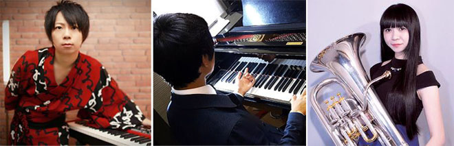 ▲それぞれAIとのピアノ連弾を披露する「紅い流星」(左)と「よみぃ」(中)、ユーフォニアム二重奏・四重奏でAIと共演する「今村耀」(右)。