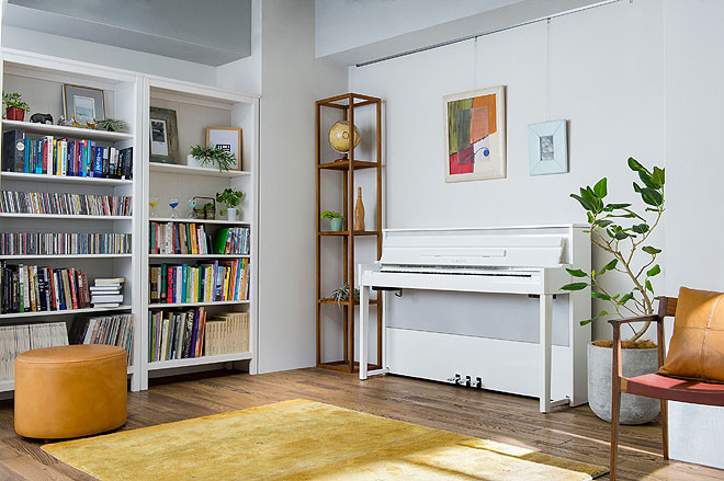 アコースティックのアップライトピアノに比べ軽量・コンパクトなのも魅力の一つ。奥行きは463mm、高さは約1mと圧迫感がなく、どんな部屋にも設置しやすいサイズ。その一方で外観は、アコースティックピアノを思わせる上質感や高級感を備えつつ、どんな部屋にもマッチするスタイリッシュなデザインに仕上げている。