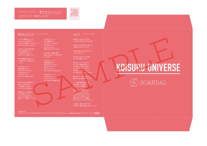 SCANDALは、明日10月6日より東名阪<SCANDAL TOUR 2017 “SCANDALの対バンツアー”>を開催する。同ツアー会場限定でiTunes予約注文者を対象に特典“「恋するユニバース」特製組み立て式紙ジャケット”の配布が決定。ライブチケットを持っていない方も対象となるほか、ライブ会場に足を運べない方には応募抽選でサイン入り特典のプレゼントを実施するとのことだ。詳細はオフィシャルサイトにて。