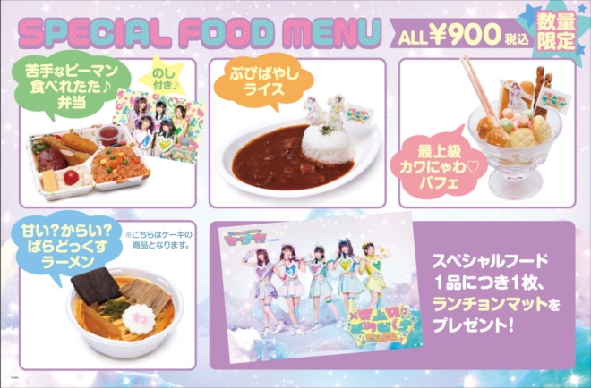 コラボカフェ「最上級ぱらどっくすCafé」は、本日10月6日(金)より原宿のコラボカフェスペース「AREA-Q」にてオープン。店内はわーすたの4枚目のシングル「最上級ぱらどっくす」にちなんだ世界観になっている。フードメニューも“逆説”という意味の“パラドックス”に基づいた「甘い?辛い?ぱらどっくすラーメン」や、歌詞から連想される「苦手なピーマン食べれたた♪弁当」などが用意されている。