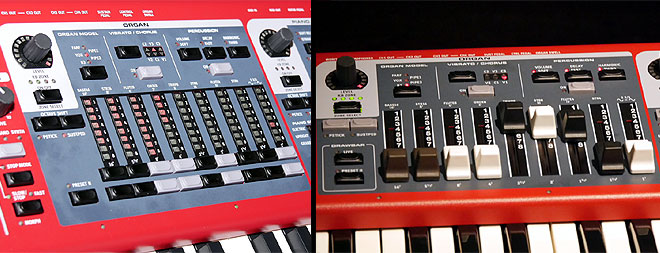 ▲「Nord Stage 3 88」「Nord Stage 3 HP 76」はデジタルLEDドローバー(左)、「Nord Stage 3 Compact」は物理ドローバー(右)を搭載。どちらも現在の設定をひと目で確認できる。