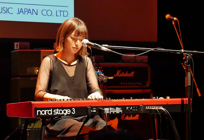 「各セクションごとに少しずつ機能がパワーアップした感じなんですけど、それをアーティストとしてライブで生かしやすいモデル。ステージですごい使いやすくなってる。一から音色を作りたい人も、これだとすごく作りやすいなと思いました。プリセットもわかりやすく付いてるので、どっちの方面からも使いやすくて、これ1台でレコーディングからライブまでいけるなっていうふうに思います。」とトークを締めくくった後は、自身が所属するバンド「テスラは泣かない。」の楽曲「Like A Swallow」を演奏。ソング・モードを活用し、曲中で音色を切り替えつつ、まさにライブ向けという「Nord Stage 3」のサウンドの魅力を存分に味わわせてくれた。