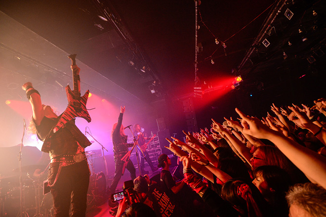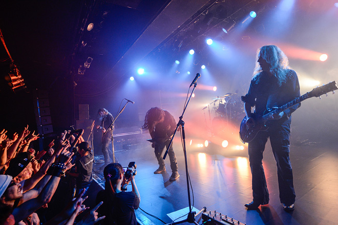 ダブル・ヘッドライナーと言っていいこの日の公演だが、まずステージに上がったのはヴェイダーだ。最新作『ジ・エンパイア』(2016)が顔面を直撃するデス・メタルの快作だったこともあり、同作からのナンバーを中心にプレイするか?…と思いきや、『リタニー』(2000)からの「翼 Wings」でスタート。1990年代・2000年代のヴェイダー・クラシックスを交えた選曲が新旧ファンを驚喜させる。『デ・プロフンディス』(1995)から「沈黙の帝国」「ソーティス」「炎の中の再生」の3曲が披露されたのは嬉しいサプライズで、早くも場内にサークル・ピットが巻き起こった。この日のセット・リストは今回のアジア・オーストラリア・ツアーでほぼ共通のようだが、既に何度も訪れている日本の観衆とのコミュニケーションは良好で、ギタリスト兼ボーカリストのピーターは「ゲンキデスカ!」「アリガトーゴザイマス!」など積極的に日本語で話しかけていた。
