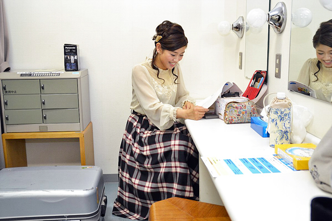 午後3時。北とぴあのつつじホールで<3人の歌仲間>が開演となった。この日の出演者は花咲ゆき美、松川未樹、桜井くみ子の3人。楽屋のあるフロアにはホールの音声が流れるようになっていて、3人の歌声や客席の歓声も聞こえてくるので、早くも盛り上がっているのがわかる。しばらくして楽屋を訪ねてみると、川野夏美はステージのドレスとは違い、リラックスした洋装で、スタッフとともに台本の内容を入念にチェックしている。“えー?こんなこと言うの?”とか“これどうやったら面白く持っていけるんだろう”と、短時間の飛び入り出演であるにもかかわらず、その表情はかなり真剣だ。