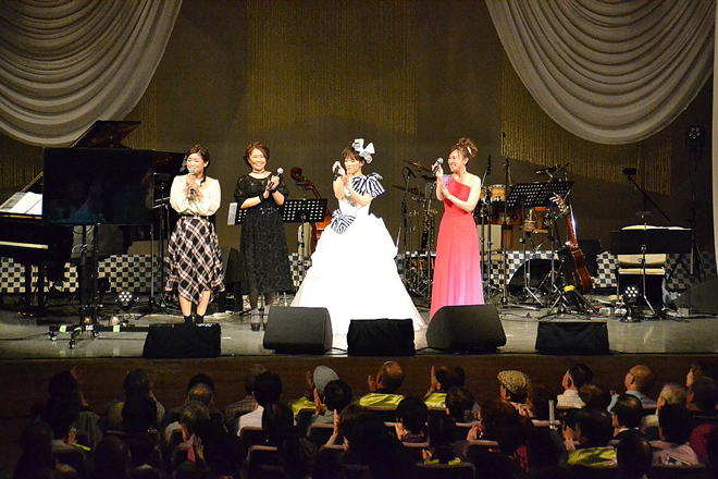 その頃ステージではトークコーナーの真っ最中。子供のころ、青春時代、といったテーマに沿っての爆笑トークの中、川野夏美が突然乱入すると、客席からは歓声が上がった。ここからは川野夏美の仕切るカラオケコーナーとなる。3人がそれぞれ、いつものステージでは歌わないような曲や、プライベートのカラオケでの十八番を披露するということになった。まずは桜井くみ子が「暖簾」をしっとりと歌い上げる。続いて松川未樹が軽やかに「酔っぱらっちゃった」、最後に花咲ゆき美が伸びやかに「ハナミズキ」を歌って、3人とも大きな拍手と歓声を浴びる。DAMの採点機能での得点も発表され、全員が80点台を叩き出した。加点チャンスの少ないワンコーラスのみだったのに、この高得点。やはりみんな本当に歌が上手い。