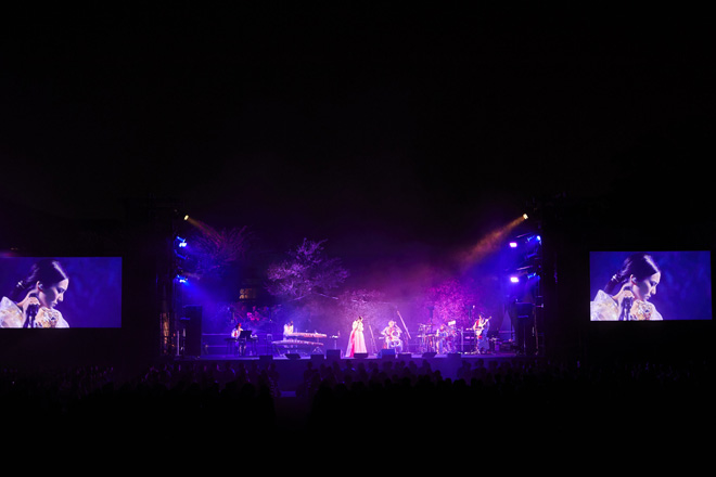 開演時間になると鐘と鈴の音に続き、観音経が流れ始めた。国の重要文化財である五重塔を背にした特設ステージに煙が立ち込め、木々には朱色のライトが照らされていた。やがて、光と煙が渦巻く中から天女のような羽衣を背負った柴咲コウが静かに、ゆっくりと姿を現した。箏の音から始まった「漆黒、十五夜」、愛しい人の来訪を切望しながら夜明けを迎える「浮雲」からなる第1部で満月の夜の終わりが告げられた。アカペラで歌い始めた手嶌葵のカバー「テルーの唄」で早くも日暮れの訪れを知り、KOH+名義によるヒットバラード「最愛」では、ステージ上がピンクに煙る中、ピアノとチェロによる美しく物悲しい調べにのせ、<おなじ月の下で/おなじ涙流した>あなたへの無償の愛を切々と歌い上げた。