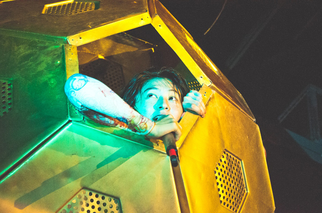 「ライト兄弟」では、巨大なオブジェに乗って、会場中を縦横無尽に動き回りながらパフォーマンスするコムアイに引っ張られ、観客も大移動。本編最後の曲「桃太郎」でステージからウォーターボールに入ったコムアイが客席に飛び込み、大歓声の中ライブは終了した。最後には台湾語で挨拶もおこなった。
