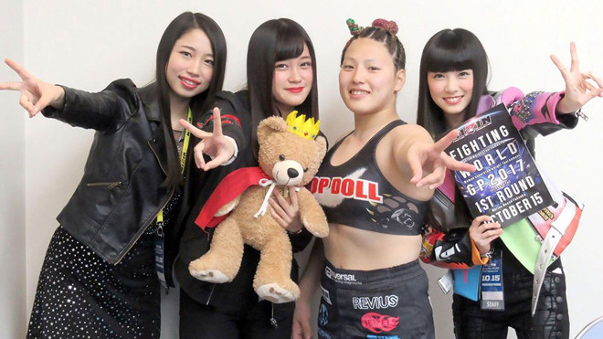 さらに、総合格闘家・KINGレイナと強力タッグを組んでいることも発表された。KINGレイナは、「YouTubeでDROP DOLLのMVを発見して、迫力のある演奏と歌声に惹かれた。彼女たちの練習スタジオに会いに行って直接タッグを申し込んだ」と明かしており、10月15日に福岡・マリンメッセ福岡で行なわれた<RIZIN FIGHTING WORLD GRAND-PRIX 2017 バンタム級トーナメント&女子スーパーアトム級トーナメント1st ROUND-秋の陣->で、「DROP DOLL」の文字入りコスチュームを着用し、DROP DOLLの楽曲「We Go」(シングル収録曲)で入場し勝利を収めている。