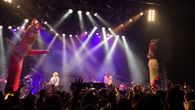 「幸運にも僕は白血病を克服して12年になるけれど、この曲はそれぞれの人生のなかで感じている辛いことと必死に戦うみんなに捧げる曲だよ」との言葉に続いて「スウィム~あきらめないで」が演奏されると、感極まって涙ぐむファンの姿も。その後もプロジェクターや巨大バルーン人形による演出を交えた豪華なパフォーマンスが続き、アンコールの最後には「セシリア・アンド・ザ・サテライト」を披露。会場一体となってのシンガロングに包まれて、この日のステージは幕を閉じた。明日19日(木)には、東京・赤坂BLITZでも単独公演が開催される。