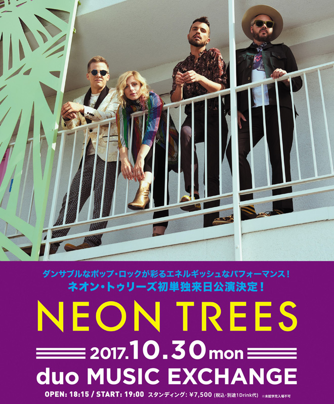 デビュー時に、米ローリング・ストーン誌が“ニュー・ウェイヴ・ポップをかき鳴らすエネルギッシュなバンド”と評したネオン・トゥリーズのサウンドは、どこまでもポップでキャッチーでダンサブル、そしてキラキラと眩い輝きを放つ。2014年にリリースされた3rdアルバム『Pop Psychology』はビルボード200で初登場トップ10入りを果たし、シングル曲「Sleeping With A Friend」の再生回数が400万を超えるなど、キャリア・ハイとなるヒットを記録している。