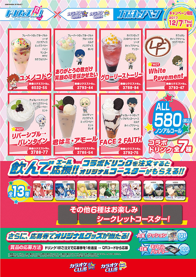楽曲をイメージしたコラボドリンク(全7種)を注文頂いた方にオリジナルコースター(全13種)のうち1種をもれなくプレゼント。さらに、抽選で豪華賞品が当たる応募券をドリンク1杯につき1枚進呈。
