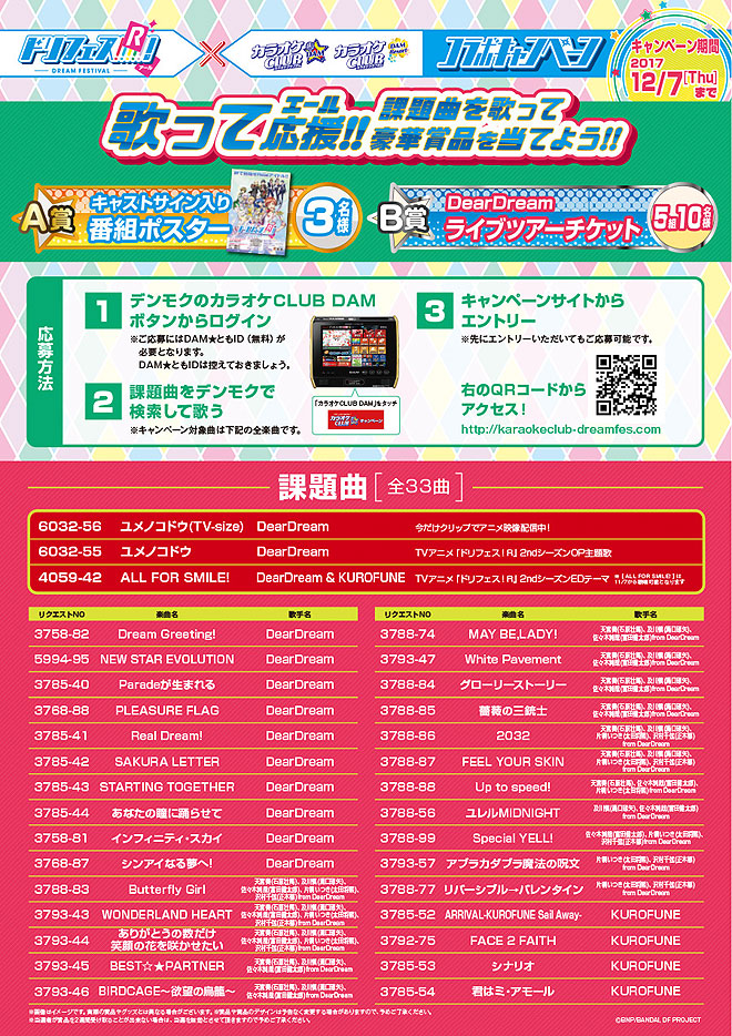 課題曲を歌って豪華賞品を当てよう! 課題曲はDAMに配信中のドリフェス!楽曲全33曲。抽選でキャストサイン入りポスターと、ライブツアーチケットが当たる。