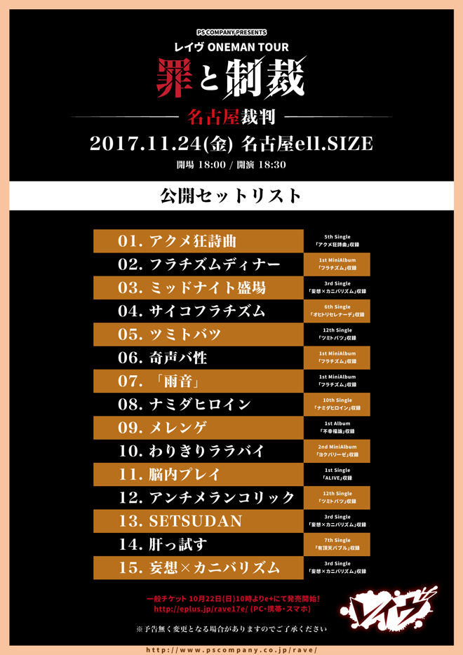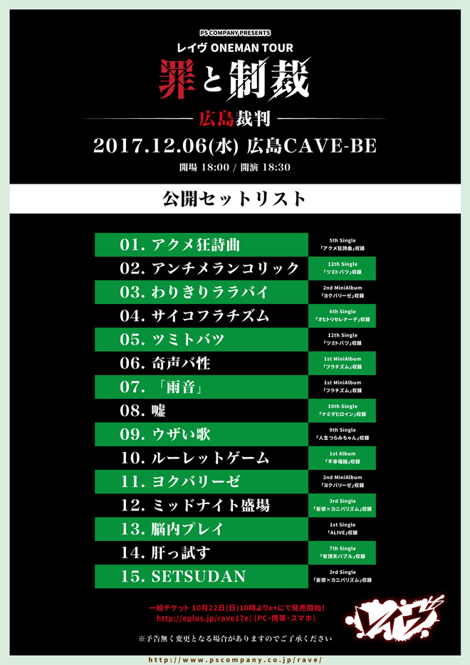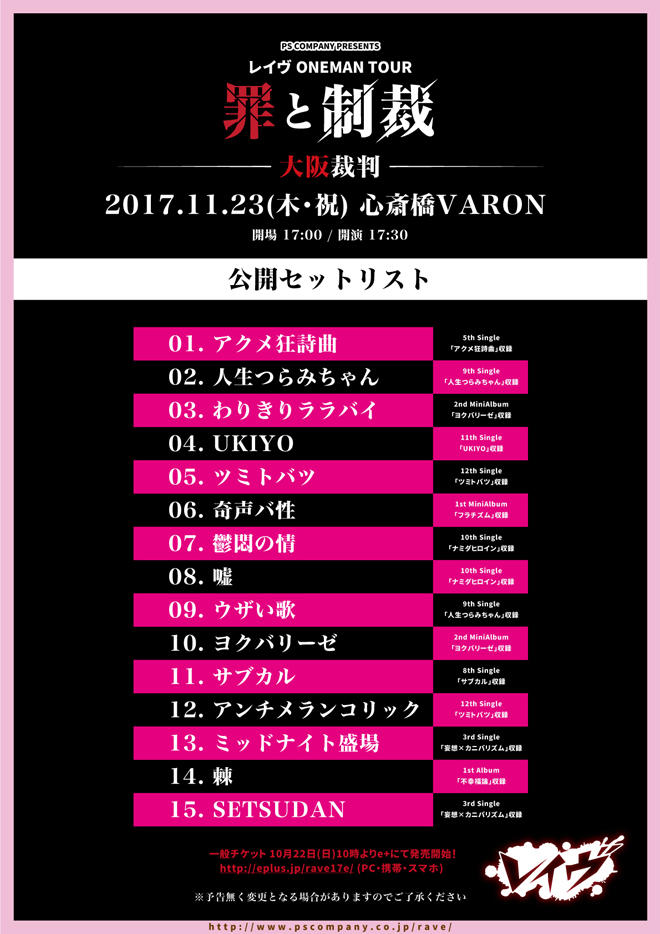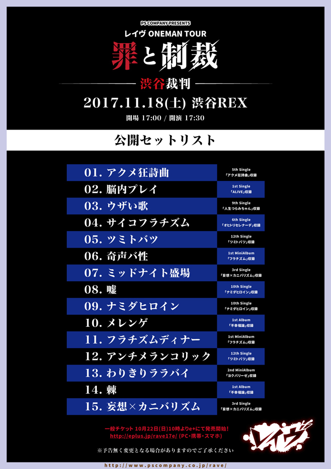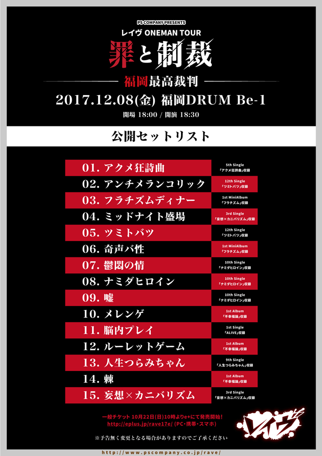 レイヴが、11月18日よりスタートするワンマンツアー<PS COMPANY PRESENTS レイヴ ONEMAN TOUR『罪と制裁』>全6公演全てのセットリストを公開した。