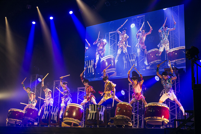 満員御礼ライブの幕開けは、祭nine.7人の太鼓打ちによる群奏からスタートした。平均年齢17.5歳、若さと男気溢れる和太鼓が鳴り響くと、今までのライブでは見せたことがないような男らしく力強い表情と急成長ぶりににファンも圧倒され、会場内を埋め尽くすような緊張感があった。