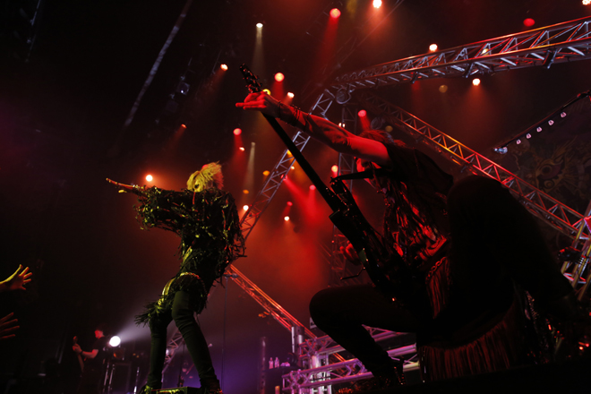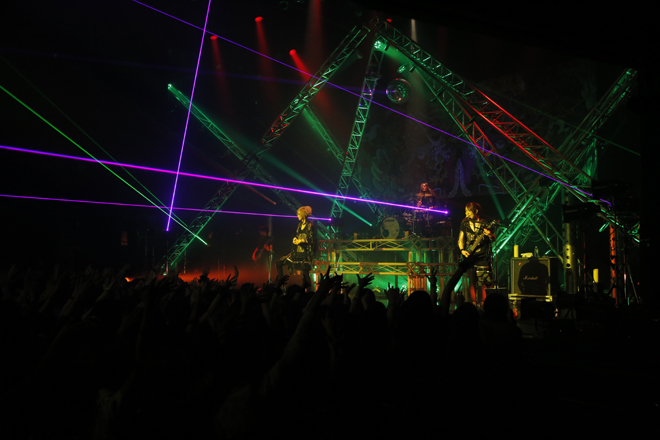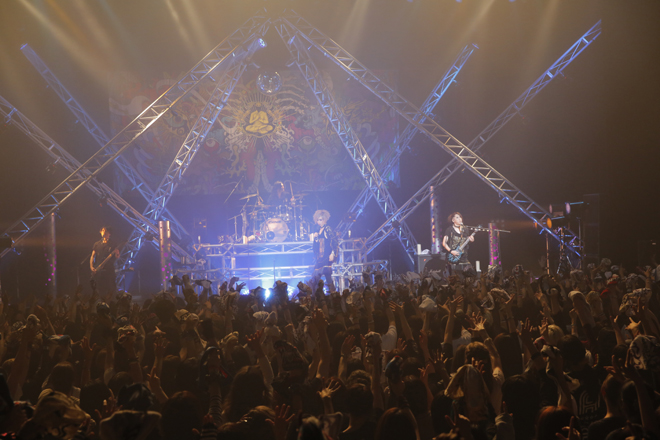 楽しませるではなく「自分たちを楽しませられるのか?」という煽りからしてLM.Cらしく、初期からのライブの定番曲であり、タイトル通りメタリックで痛快な「METALLY」ではAijiのハードエッジなギターが炸裂し、mayaがアドリブで歌詞を変えて“転がせ赤坂”と歌い、間奏ではmayaがペットボトルの水をAijiに手渡し、一口飲んでフロアーに撒くと大歓声。たたみかけるように最新アルバム『VEDA』から“命短し悟りを掴み取れ”とメッセージする「CHAKRA」が投下された。数え切れない拳が突き上げられる景色の中、mayaが黒いタンバリンを叩きながら歌ったのはLM.C王道のポジティブロックチューン「DOUBLE DRAGON」。前半戦ではスピード感のあるライブ運びに惹きつけられたが、2度のツアーを経た彼らはまだまだこんなものじゃなかった。