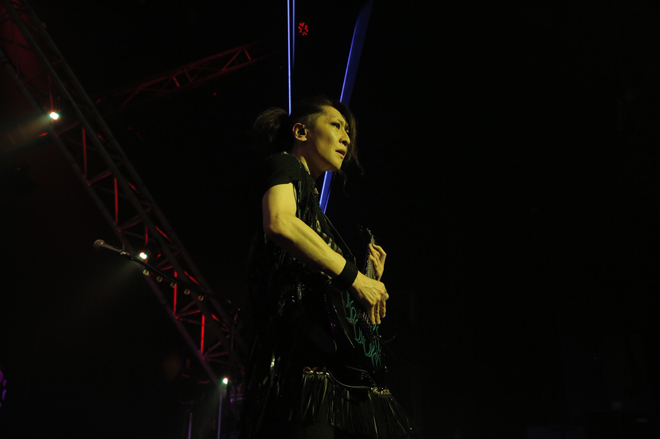 次の瞬間、ハンパない熱量をクールダウンさせるかのようにステージに薄い幕がかかり、沙幕に映し出された光のマジックが都市の夜を泳ぐイルミネーションのようだった切なくも美しいバラード「Phobia」が披露されるとライブのムードは一変した。Aijiのギターがほろ苦く響く「Kiss me?」で深くロマンティシズム溢れる世界へと引き込まれ、『VEDA』の世界の動と静の世界を思う存分堪能できた中盤のセクションはLM.Cのライブを幾度も彩ってきた名曲「僕らの未来。」で締められ、みんなの歌う声が響きわたった。