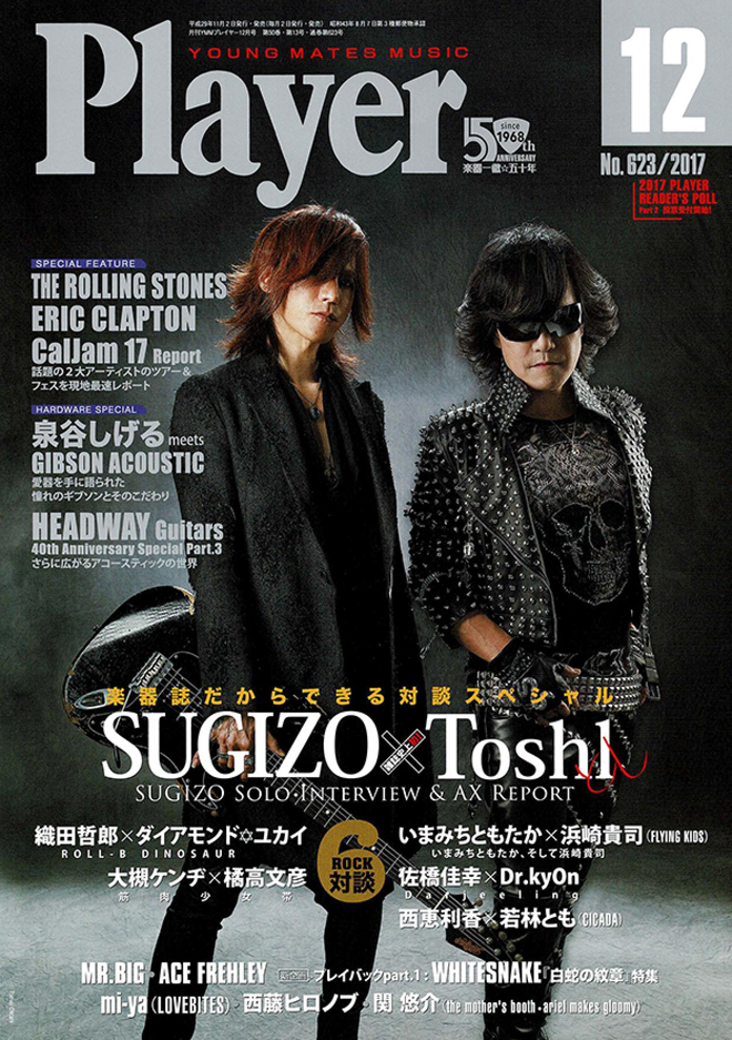 SUGIZOとToshlが、創刊50周年を迎える音楽雑誌『Player』2017年12月号(11月2日発売)の表紙に登場。雑誌史上初となる対談も掲載されている。