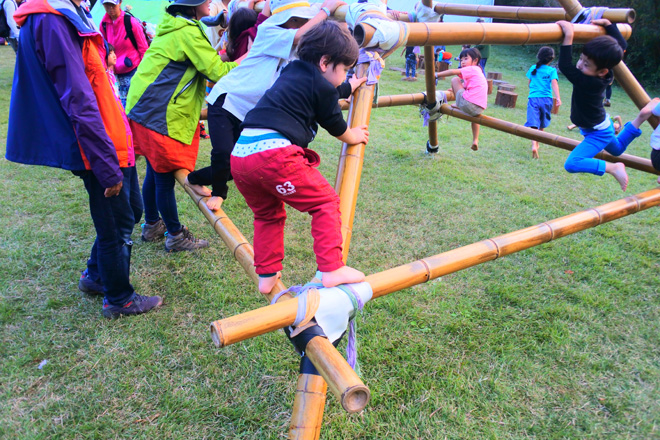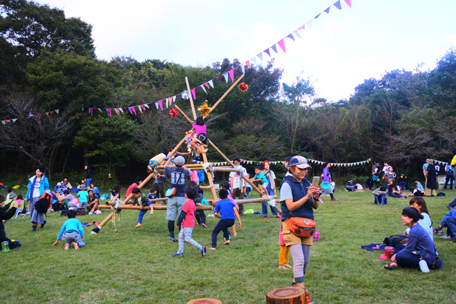 私がそう感じた場所は会場内に設けられた子どもが遊ぶためのエリアである朝霧Jamのキッズランドでした。芝生の広がる敷地内の中央部にあったプレーパークの象徴的な遊具でもある竹で組まれた巨大なタワー、それは今年の夏、フジロックの開催直前に近所のプレーパークで遊んだ時には登れなかった代物です。今回息子は自分の力だけでその一段目を登ることができ、筆者もその瞬間を見守ることができました。子が初めて何かを成し遂げた時に見せる表情や子の喜びを共にすることは、子育てをしている自分への極上のご褒美ですし、それを自分の好きな音楽フェスという場で得ることができるのはとても嬉しいことです。