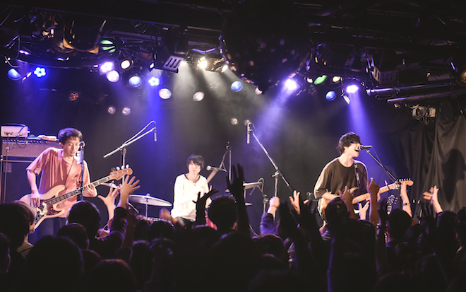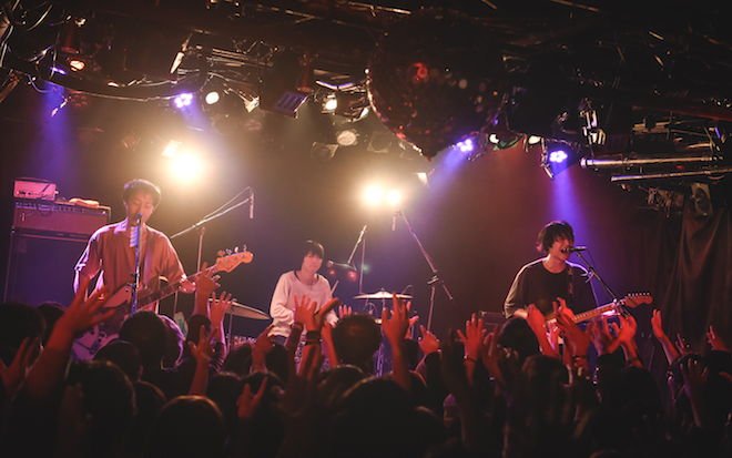 「本日は足元の悪すぎる中、ご来場いただきありがとうございます!」と宍戸がMCで口にした通り、当日は台風の影響で生憎……というか相変わらずの豪雨に見舞われた。トラブルと豪雨はツアーのお約束になりつつある彼ら。思わず宍戸からは「逆境飽きた!」なんて言葉が飛び出したほどだ。しかし、そんな状況でもバンドを続けて来られたのは、その度に応援してくれる人がいて、逆境と同じくらい良いことが返ってきたからだと、彼は続けた。バンド活動は、CDを買って、ライヴに足を運んでくれる人なくしては成り立たない。それは言わずもがなだ。でも、その背景にはどんな逆境に見舞われても、決して下を向かなかった彼らのひたむきさと、バンドや音楽への愛があるのだと思う。逆境に見舞われた時こそ、人任せにせず、メンバー自らバンドの舵を取り、乗り切ってきた。そのことが3人の結束を強くして、より緻密なアンサンブルを生み出すに至ったのだろう。
