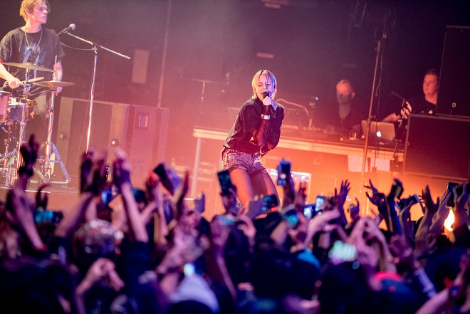 巨大なロゴを配したステージに、「When I Was Young」のオープニング曲でもある「Roots」を歌いながら登場したMΦ。脇を固めるのは腕利き揃いの3ピースのバンドだ。その「Roots」が好例で、今回のEPで掘り下げたダウンビートでダークな曲を、従来からのアゲ系のダンスポップと対比させて表現のバリエーションを見せつける彼女は、ステージをたっぷり使ってワイルドに踊りながら、ちょっとクセのあるハスキーな歌声を会場に響き渡らせる。踊っていない時はステージの端に座ったり、でなければフロアに降りてオーディエンスとの距離を縮めようとする、そんなMΦの存在感とエネルギーは並大抵じゃなくて、パンクバンドで経験を積んだ彼女のルーツが窺えるというものだ。