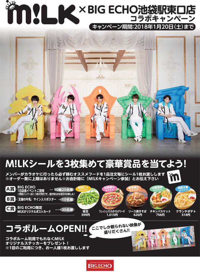 M!LKオススメメニューを注文して豪華賞品を当てよう! M!LK×BIGECHO池袋駅東口店コラボキャンペーン