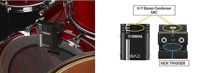 「EAD10」は、音源部のメインユニットと、マイクとトリガーが一体となったセンサーユニットから構成。アコースティックドラムのバスドラムにセンサーユニットを装着することで、高音質なアコースティックドラムの収音やエフェクトによる音色加工がカンタンに行える。また、ドラムを叩いた振動をトリガー信号として音源モジュールに送り出すことで、アコースティックドラムの生音にエレクトロニックサウンドを重ねて鳴らせるので、より多彩な演奏表現が可能。さらに専用のiOSアプリを使えば、カンタンに高音質な演奏動画を作成することができる。