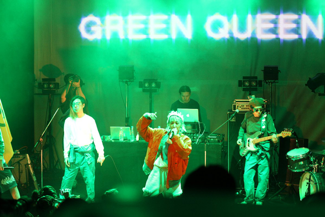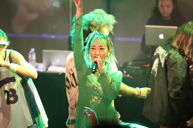 PARKGOLFのオープニングDJを引き継いで場内にオープニングSEが流れ、あっこゴリラがバックを務めるBANANA’Sのメンバー達と共に登場。客席が騒然となる中、あっこゴリラの「『ウルトラワンマン』へ、ようこそ! ここはジャングル! 野生に帰る準備は良いですか?」という声が響き、ライブは「Back to the Jungle」から始まった。グリーンのアオザイを身にまとい、ステージを行き来しながら弾力感のあるラップを聴かせるあっこゴリラは強い存在感に満ちている。彼女が放つ眩いオーラとアッパーなサウンドに客席のテンションは高まり、場内はオープニングから熱気に包まれた。