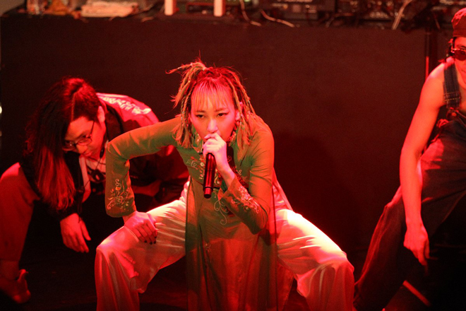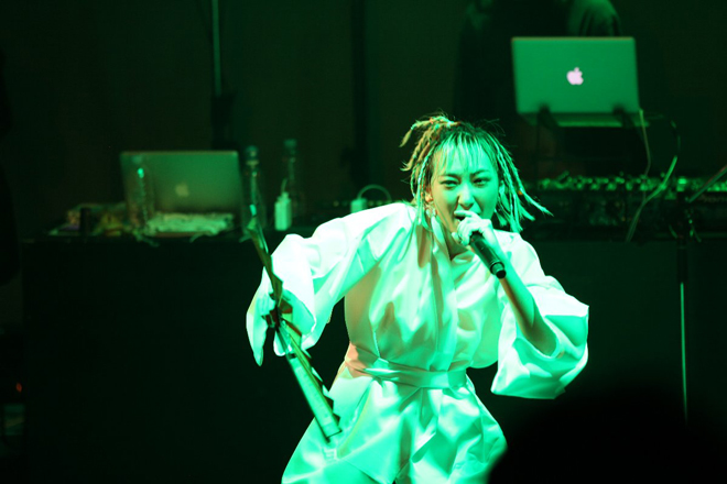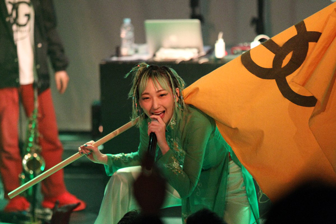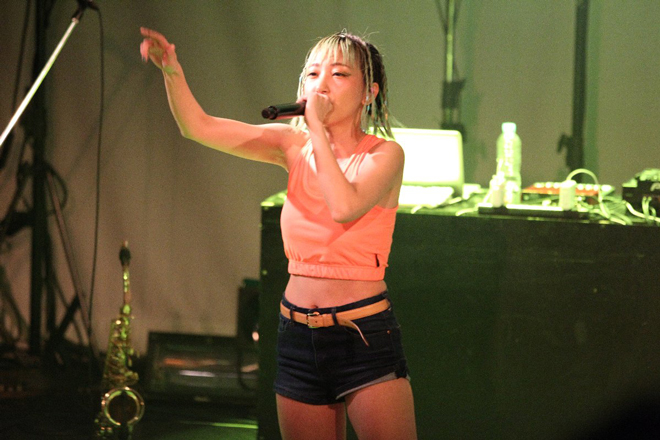 中盤では、彼女の実兄のことを歌った「お兄ちゃん」や生ドラムとベース、ギター、サックスが生み出すファンキーなサウンドが心地好い「TOKYO BANANA」、あっこゴリラが白装束姿で姿を現して、一休和尚のことをディスリまくる「ハゲ」などをプレイ。一種独特で、どこかシュールな味わいすらあるあっこゴリラの歌詞は本当に面白いし、滑舌が良いため歌詞を知らなくても何を歌っているのかが分かるのは彼女の大きな強みといえる。それぞれの曲調に合わせて細やかにラップのニュアンスを変える巧みさや群を抜いたリズム・センスの良さ、魅せ方の多彩さなども含めて、あっこゴリラの表現者としてのスキルの高さを十分に味わうことができた。