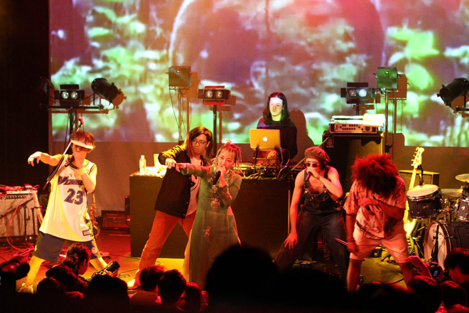 「Back to the Jungle」で作り上げた良い雰囲気を保ったまま、キャッチーなサビ・パートを配した「黄熱病」やトリップ感を纏ったサウンドと熱いラップの取り合わせを活かした「PETENSHI」、ゲストの食品まつりがクリエイトするオリエンタル&サイバーなバック・トラックとバスケットをテーマにした歌詞の取り合わせというユニークさが光る「電光石火」などを相次いでプレイ。BANANA’SのSP(g)とKAHADIO(ds)が「黄熱病」ではラッパーにチェンジし、さらに「PETENSHI」ではBANANA’S全員がVOXやダンスを務めるなど、曲によって演奏形態が変わることはあっこゴリラのライブの大きな魅力といえる。それぞれの楽曲のテイストを増幅して聴かせることで、ライブ全体が起伏に富んだ構成になっていることが印象的だった。
