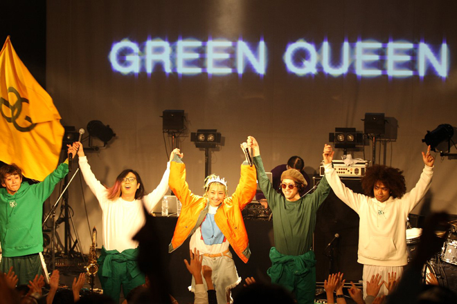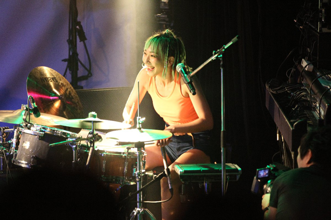 「あっこゴリラです! 人呼んで“GREEN QUEEN”です。よろしく!」という最初のMCを挟んだ後は、あっこゴリラがBANANA’Sと共に客席に降りて、ラップをしながら場内を1周するというパフォーマンスを見せた「シン・ゴリラ」や、あっこゴリラがオレンジのタンクトップにブラックのショートパンツという姿に衣裳を変えてフィジカルなステージングを展開した「遺書」などが演奏された。様々なアイディアでオーディエンスを楽しませ、場内のボルテージをどんどん引き上げていくあっこゴリラはさすがの一言。華やかさと硬派なイメージを併せ持ったキャラクターも本当に魅力的で、彼女の一挙手一投足にオーディエンスが強く惹き寄せられていることが如実に伝わってきた。