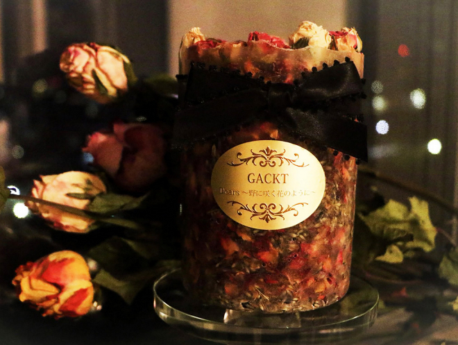 GACKTの名曲「野に咲く花のように」をモチーフに、アロマキャンドルにローズ、ラベンダーをいっぱいに敷き詰めました。キャンドルからはローズの香りが。