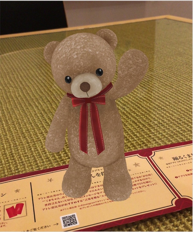 さらには、12月1日より宇多田ヒカルの新曲「あなた」とアトレ恵比寿とのコラボキャンペーンが展開中だ。同キャンペーンの一環として、西館1Fにある猿田彦珈琲店とのコラボカフェで新企画が12月9日(土)よりスタートする。これは、猿田彦珈琲店のテーブルに貼ってあるステッカーにARアプリ「ARAPPLI」をかざすと、テーブルの上に3Dくまちゃんが登場するというものだ。